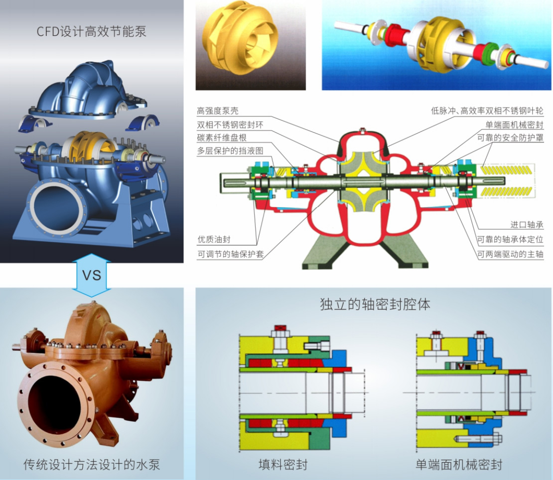 2、采用水力性能优化技术和双向流叶轮技术,效率比常规泵高5〜8%,高效范围宽6~ 10%;